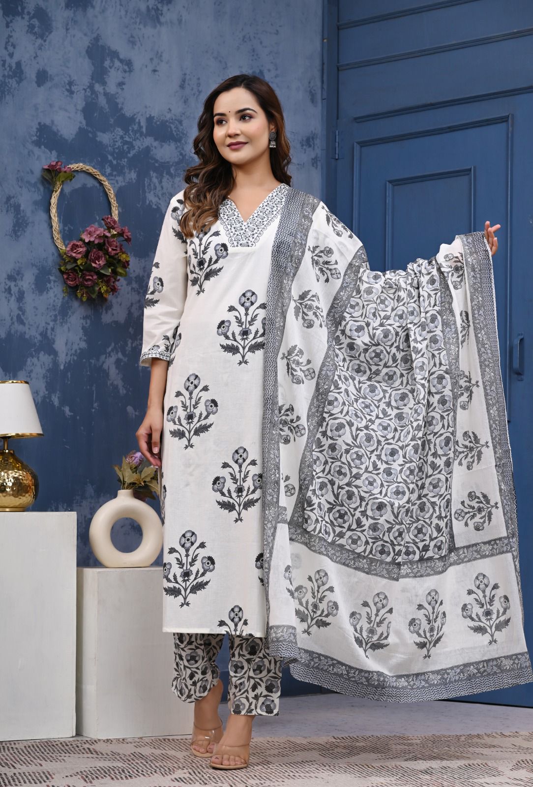 A refined ethnic outfit featuring elegant floral motifs, paired with coordinated pants and a beautifully printed dupatta. Perfect for graceful everyday styling and cultural gatherings.