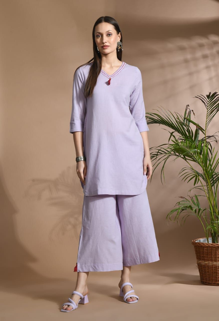The relaxed pants complete the outfit by offering comfort and flexibility for long hours of wear. Whether styled for casual outings, day gatherings, or everyday wear, this kurta set offers a perfect balance of modern fashion and timeless ethnic elegance.